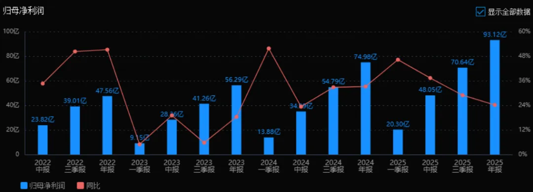 2025年归母净利润为 93.12亿元,相较于2024年的74.98亿元增长了 24.20%。评价:净利润增速高于营收增速,表明公司盈利能力增强,规模效应或成本控制有所体现。
