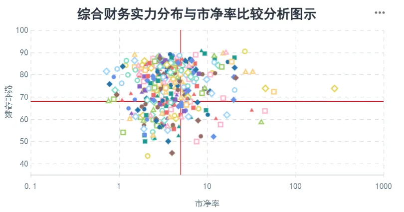 在公司的发展能力、经营稳定性及增长潜力的基础上,结合公司主营业务所属行业的分析、资产结构或资产质量分析、主营业务运营效率分析、受评主体的行业地位分析以及偿付能力的分析做出的公司综合财务实力分析判断。分数越高,公司的综合财务实力越强。处在右下区域的公司,市净率较高且相关指数较低,则存在公司综合财务实力不足的潜在风险。