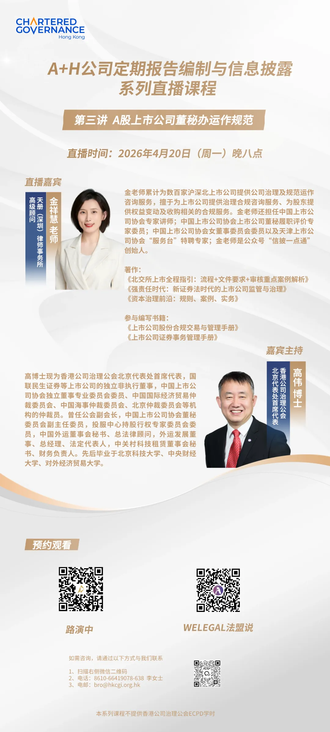 香港公司治理公会A+H公司定期报告编制与信息披露系列直播课程第三讲:A股上市公司董秘办运作规范将于4月20日晚8点开播。敬请期待!