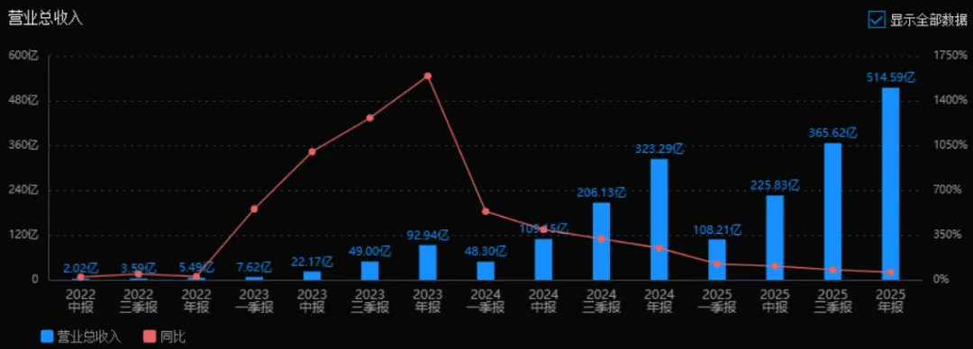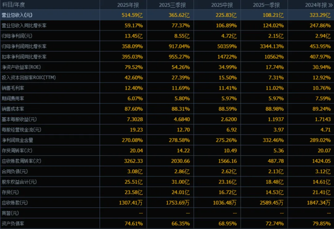 2025年营业总收入为514.59亿元,相较于2024年的323.29亿元增长了59.17%。评价: 公司收入端保持高速增长,虽然较2024年247.86%的同比增速有所放缓,但绝对值大幅提升,显示公司仍处于快速扩张阶段。