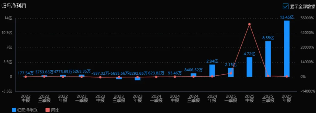 2025年归母净利润为13.45亿元,相较于2024年的2.94亿元增长了358.09%。评价: 利润增速远超收入增速,表明公司盈利能力显著增强,规模效应或成本控制效果明显。