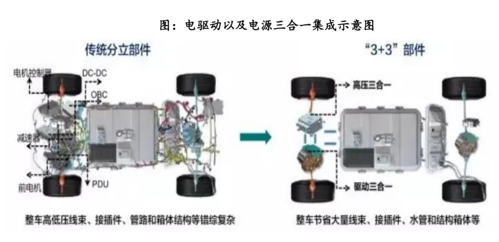 2)轻量化方面:以比亚迪产品为例,相比分立式产品,其电源三合一产品体积缩小40%,整体重量均降低25%。