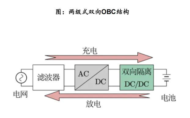 • 双向 OBC 可以满足新能源汽车双向充放电的需要。传统的OBC只能为动力电池充电,不能实现向外供电。双向OBC可实现的功能包括V2L (Vehicle-to-load,车对负载)、 V2V(Vehicle-to-vehicle,车对车)、V2G(Vehicle-to-grid,车对电网)等。