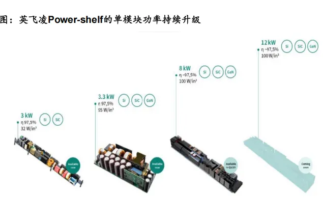 (1)高功率趋势一致:AIDC服务器电源向12KW高功率发展。嵌在服务器机架上的PSU将交流电转换为直流电为服务器供电,AI算力需求增加导致服务器的总功耗增加,需要更高功率的PSU来满足供电需求。英飞凌PSU升级路线图中,PSU从3kW、3.3kW到8kW、12kW的电源功率进阶,高功率趋势与车载电源重合,后者功率已从最早的3.3kw向11/22KW持续升级。