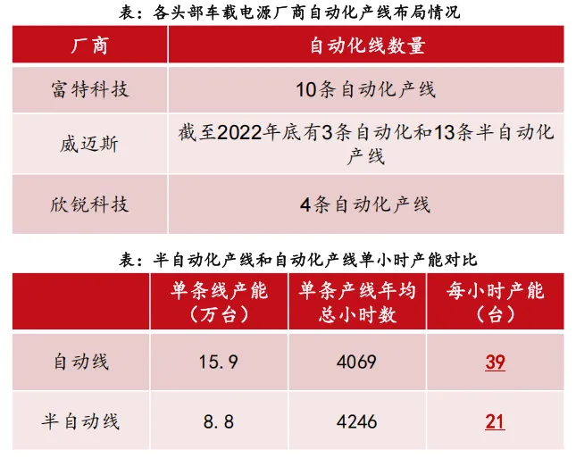 (2)头部厂商资金充裕,建设自动化产线速度更快。 目前头部厂商均已快速布局自动化产线,根据威迈斯第二轮问询回复函,建设一条自动化产线需要2000万左右的前期投入,资金充裕且订单量大的厂商更有能力建设自动线。根据威迈斯披露, 自动化产线单小时产能相比普通产线高86%,能够帮助头部厂商提高生产效率,降低存货周转。