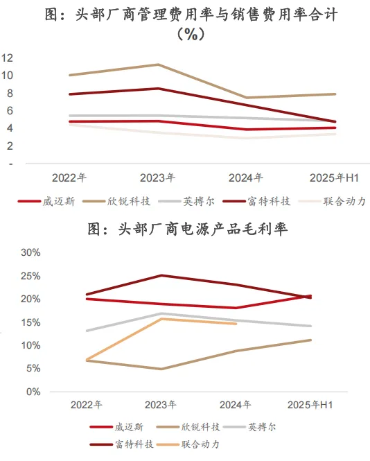 由于下游整车价格竞争较激烈,车载电源行业利润率整体呈下行趋势。威迈斯通过规模优势、出海、自研磁集成技术并不断推出新一代产品,在净利率和毛利率上均获逆势增长,净利率从22年的7.7%增长至25年H1的9.2%,在规模和盈利水平方面都维持行业第一梯队。