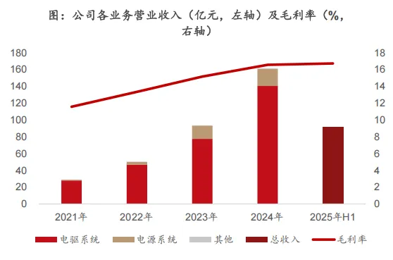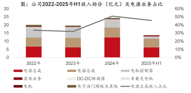 公司位于新能源汽车车载电源行业前列,2025H1车载充电机市占率10%,在第三方中位列第二。公司主要为新能源汽车和氢能与燃料电池行业提供全方位高压“ 电控”解决方案。1)新能源汽车业务核心产品:包括车载充电机OBC,车载 DC/DC 变换器,“二合一”或“三合一” 车载电源集成产品,广泛应用于乘用车、客车、专用车等。公司凭借高研发能力及产品高性价比深度绑定客户,主要客户包含比亚迪、吉利、小鹏、理想、赛力斯、奇瑞、本田、奔驰等,2025H1市占率达9.6%,相比2022年增长近4pct 。2)氢能与燃料电池业务核心产品:大功率 DC/DC 变换器 DCF,DCF、OBC、低压直流变换器 DCL、空压机控制器 MCU、PTC控制器、电源分配单元 PDU、电堆巡检 CVM 集成的商用车“ 多合一” 总成,广泛应用于燃料电池乘用车、客车、专用车(中卡、重卡等)和燃料电池机车等。