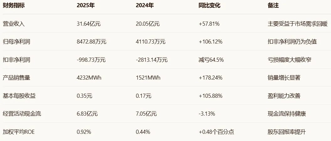 派能科技作为国内首家以储能为主营业务的上市公司,在2025年实现了业绩的显著复苏与增长。公司2025年实现营业收入31.64亿元,同比增长57.81%;归母净利润8472.88万元,同比增长106.12%;产品销售量达4232MWh,同比大增178.24%。在全球储能市场结构性改善的背景下,公司凭借完善的全球化布局、多元化产品矩阵与持续的技术创新能力,实现了国内外市场协同均衡发展,进一步打开了业绩增长空间。