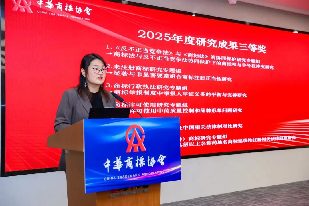 中华商标协会秘书长助理(挂职)郑楠发布了商标法律前沿问题研究专题组2025年度优秀研究成果评选结果及优秀联合主持人名单。她介绍,相关研究成果将陆续在《中华商标》杂志发表,为行业提供参考与学习资源。