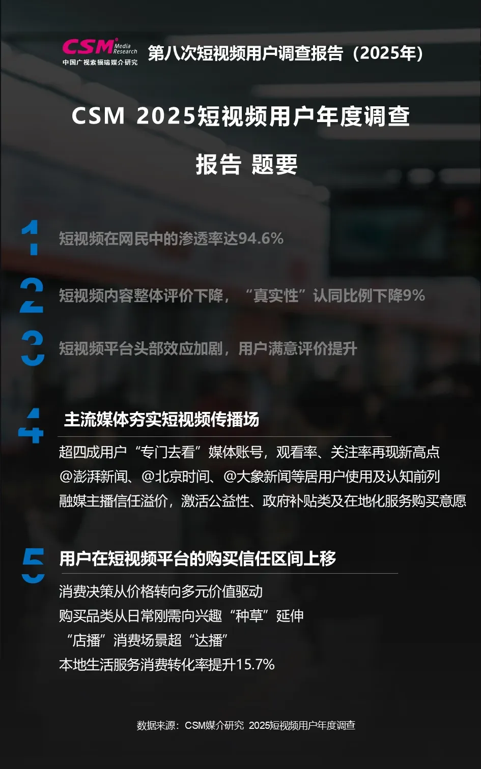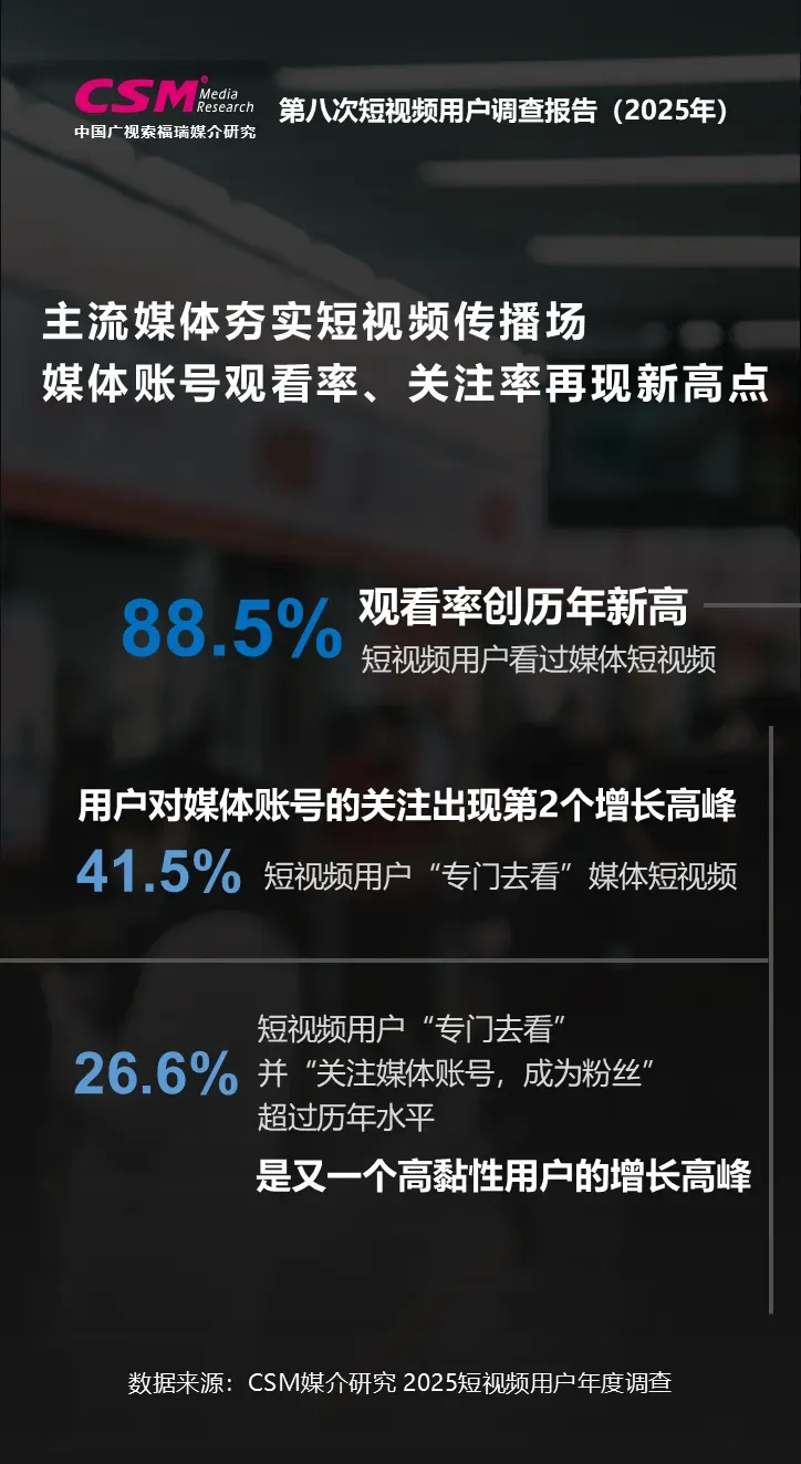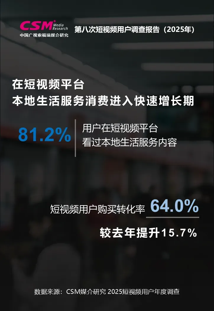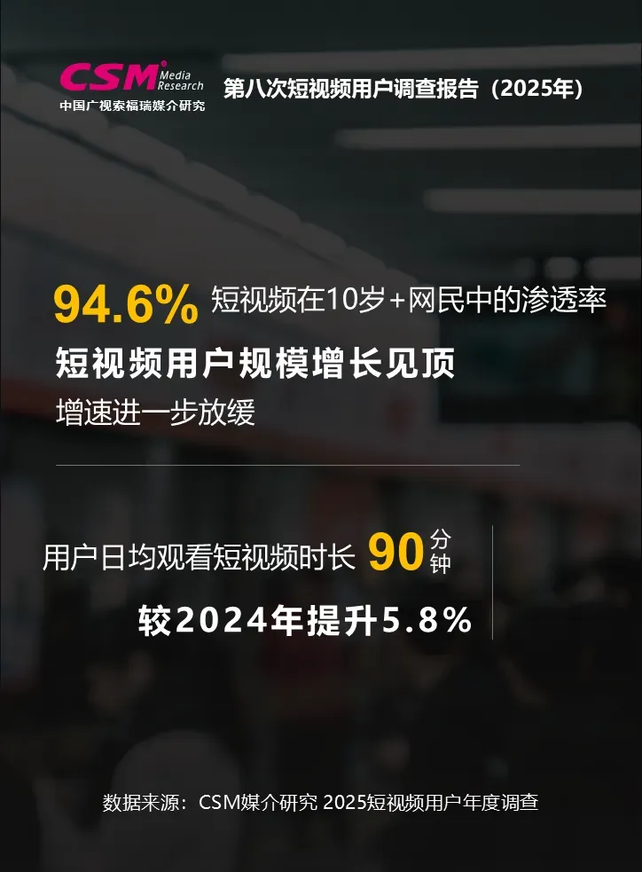 中国广视索福瑞媒介研究(CSM)发布《第八次短视频用户价值年度调查报告(2025)》。CSM媒介研究持续关注短视频行业发展及用户变迁,于2025年10-12月开展了第八次短视频用户年度调查,调查覆盖全国10岁及以上短视频用户,涉及短视频使用行为、内容偏好、平台评价、电商消费、主流媒体传播、用户生活形态等方面,并对微短剧、地方文旅体活动等热点领域开展专题调查。
