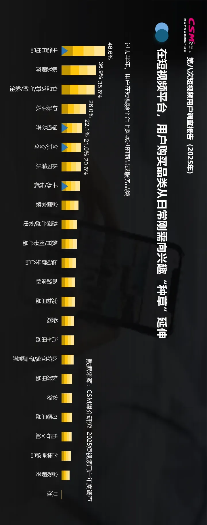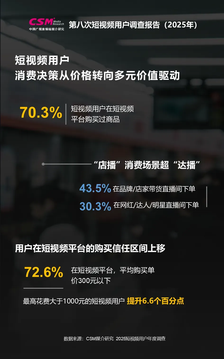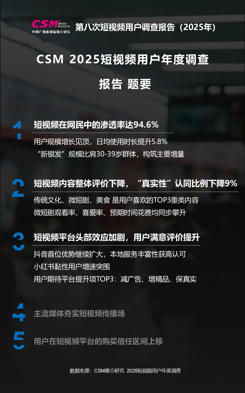 中国广视索福瑞媒介研究(CSM)发布《第八次短视频用户价值年度调查报告(2025)》。CSM媒介研究持续关注短视频行业发展及用户变迁,于2025年10-12月开展了第八次短视频用户年度调查,调查覆盖全国10岁及以上短视频用户,涉及短视频使用行为、内容偏好、平台评价、电商消费、主流媒体传播、用户生活形态等方面,并对微短剧、地方文旅体活动等热点领域开展专题调查。