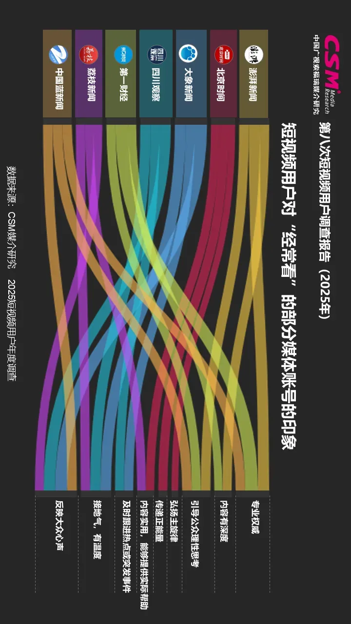 针对30多个地方媒体新闻类账号的调查显示,从用户“经常看的账号”及其对账号内容的印象两个维度综合来看,@澎湃新闻、@北京时间、@大象新闻、@四川观察、@第一财经在此次调查中综合得分居前列。短视频用户对不同的媒体账号形成了各具特色的印象认知,如对账号@澎湃新闻“专业权威”“引导理性思考”“内容有深度”的印象更为突出,具有相似特点的账号,还有@第一财经;@北京时间在“传递正能量”“内容实用,能够提供实际帮助”“弘扬主旋律”等方面,给用户留下鲜明印象;@大象新闻、@四川观察在“反映大众心声”“接地气、有温度”“反映迅速,及时跟进热点”三个特点上,赢得高黏度用户更多认同。