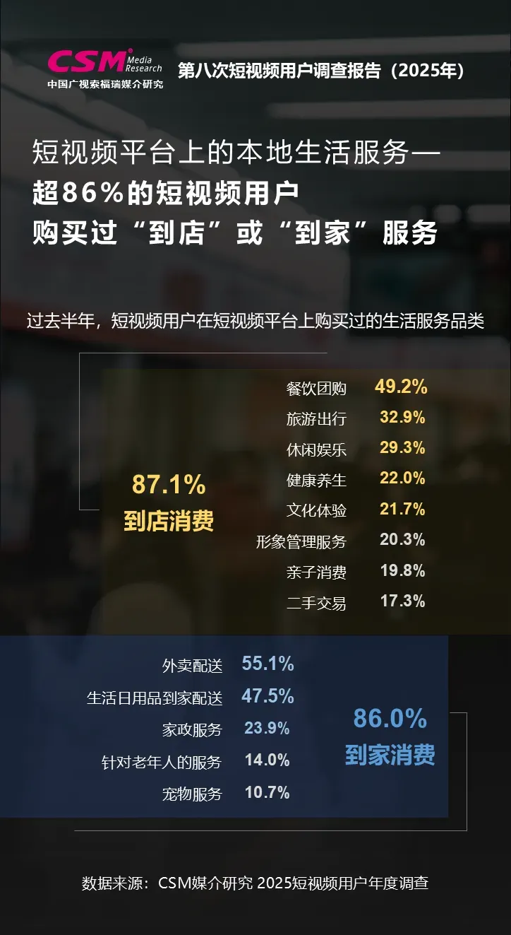 本地生活服务消费转化率环比增长15.7%,“到店”与“到家”的消费意愿高,短视频用户的消费比例均超86%。过去半年,在短视频平台上,本地生活服务相关内容渗透率达81.2%;购买转化率为64.0%,较2024年增长8.7个百分点。从消费品类来看,超86%的用户表示有过“到店”与“到家”消费,其中外卖配送、餐饮团购、生活日用品配送到家为购买率前三的品类,“吃”与“用”成为本地服务消费的核心驱动力。