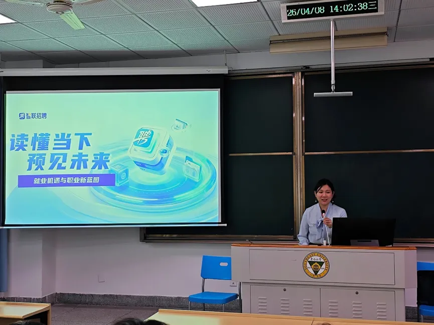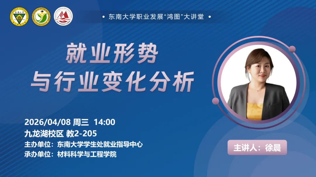 2026年4月8日下午,由东南大学就业指导中心主办、材料科学与工程学院承办的“鸿图”大讲堂专题讲座系列活动在九龙湖校区教2-205成功举办,本期活动特邀智联招聘校园及国际业务事业部执行总监徐晨老师,开展主题为“就业形势与行业变化分析”的讲座分享。讲座内容围绕当前就业形势研判、热门行业变化解析及学子应对策略三大板块展开,帮助同学们认清趋势、明确方向,在求职路上抢占优势。