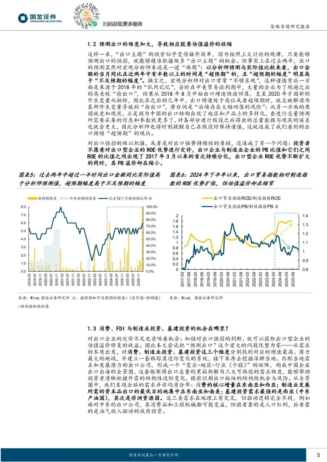 与此同时,对出口数据的精准预测成为"难题",总量出口增逸的预测值往往低于实际值,且难以捕捉结构性的变化,其对出口出海板块的投资指导意义下降,进而导致出口。上市公司呈现ROE优势持续扩大、但PB估值溢价不断收缩的分化格局,因此,围绕外需结构与边际变化的精细化研究,将成为把握出口主题投资机会的核心抓手。