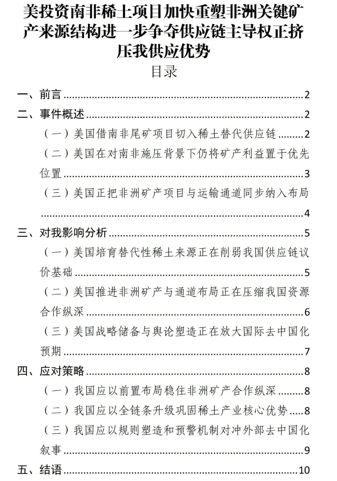 值得注意的是,在美南非关系仍存明显裂痕的情况下,特朗普政府并未放缓该项目推进,而是继续将其纳入关键矿产安全和供应链替代布局之中。相关动向表明,美国已不再满足于一般性资源合作,而是在以资本投入、项目孵化和非洲矿产通道布局相结合的方式,加快重塑关键矿产来源结构,全球稀土竞争正在由产能争夺进一步转向供应链主导权争夺。