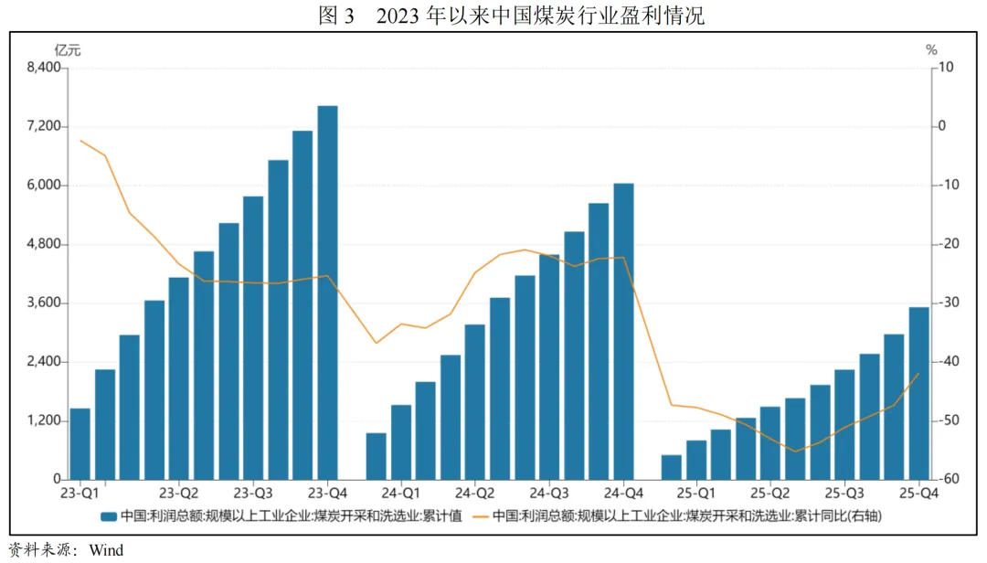 从煤炭企业盈利情况看,2025年,受煤炭价格震荡回落影响,煤炭企业整体盈利水平有所下降。2025年,全国规模以上煤炭企业实现利润总额3520.00亿元,同比下降41.80%。