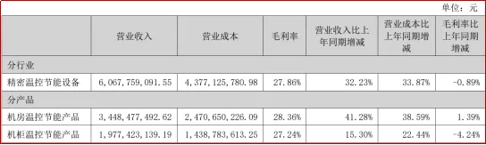 机房温控节能产品:营收34.48亿元,同比增长41.28%,占总营收56.8%,毛利率28.36%,同比提升1.39个百分点。