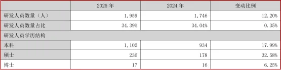 截至2025年末,公司研发人员达1,959人,占员工总数的34.39%,较上年增长12.20%。团队中本科及以上学历占比67.7%,硕士236人、博士17人,核心研发力量持续壮大。