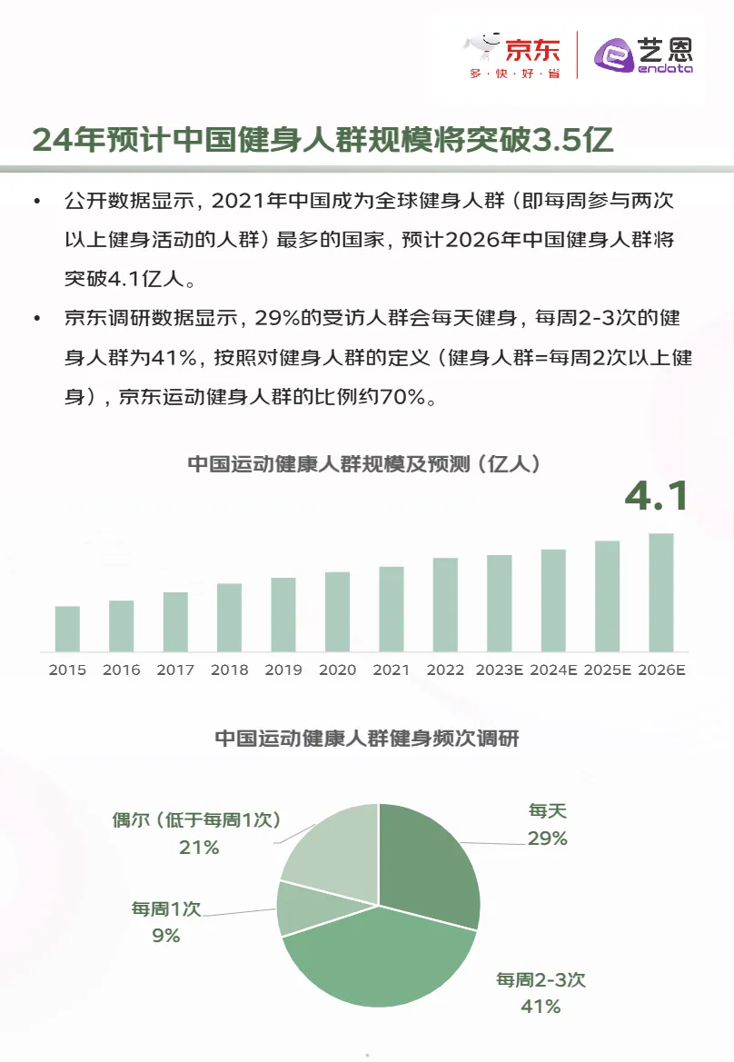• 市场规模持续扩容,2026年中国健身人群将突破4.1亿人:当前已有70%的京东运动用户达到高频健身标准(每周2次以上),带动健身服品类进入稳定高增长通道,为品牌提供广阔增量空间。