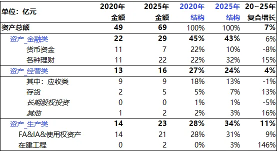 2020年以前,江中的分红比例维持在33%至36%的常规水平;自2021年起,公司开启了“豪横”分红模式,比例大幅提升至81%,2022年与2023年更是分别达到121%和115%,2024年与2025年也稳定在96%左右。小结:江中是一家经营稳定、注重股东回报的公司。高比例的分红也显示了公司对对未来现金流的充足信心。四、资产负债表