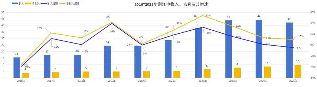 先看整体趋势,2016年~2025年,2016年至2025年,收入从15.6亿元增长至42.2亿元,9年复合增速11.7%;净利润增速11.2%。最近5年(2020年~2025年)的复合增速为11.6%。净利润增速15%。
