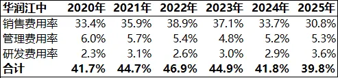 2020~2025年销售、管理及研发三大费用的收入占比均值43%,接近东阿阿胶同期的水平42.6%——仍有优化空间。