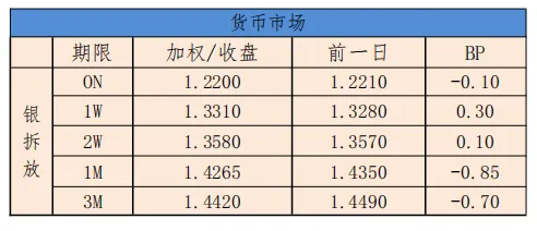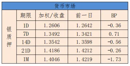 今日银行间市场主要回购利率整体下行。隔夜加权平均利率收盘于1.2606%,上日的收盘价为1.2642%,下行0.36BP;14天收盘价为1.3542%,相比较昨天的收盘价格1.3598%,下行0.56BP。
