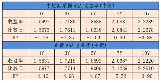 中债中短期票据收益率曲线(AAA)1年期收益率下行1.78BP,至1.5497%,3年期收益率下行4.25BP,至1.7186%。