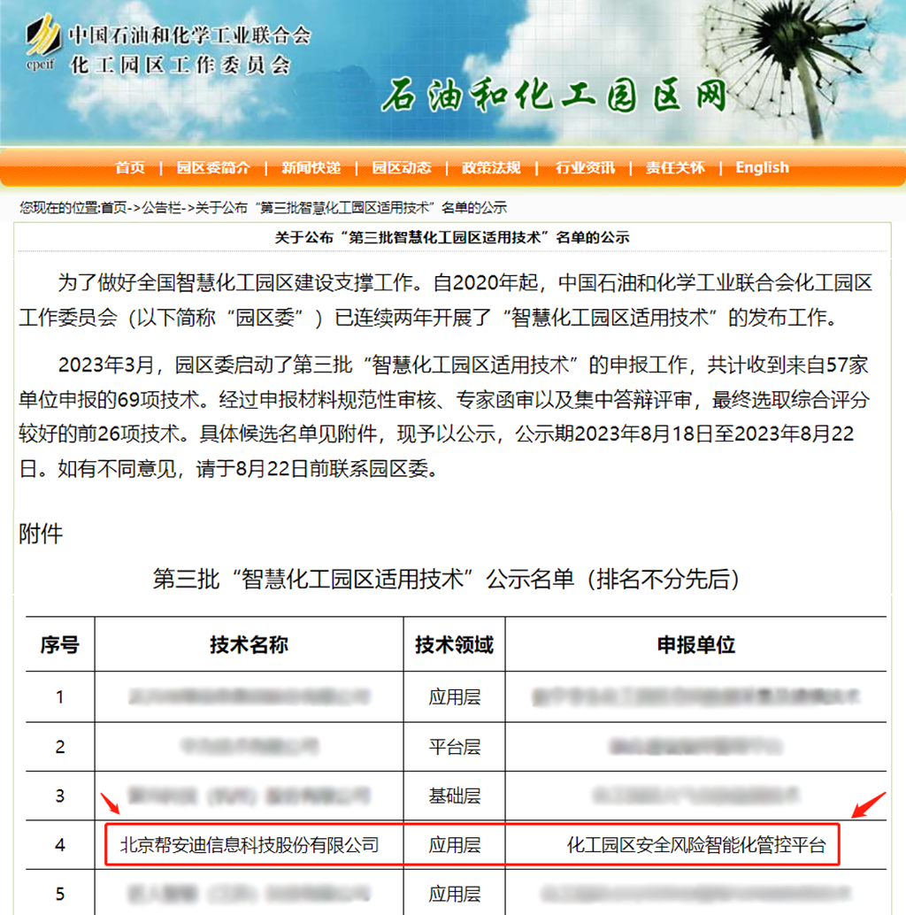 为了深入贯彻落实《工业和信息化部关于促进化工园区规范发展的指导意见》《关于“十四五”推动石化化工行业高质量发展的指导意见》文件精神,做好智慧化工园区建设技术支撑工作,2023年8月15日,中国石油和化学工业联合会化工园区工作委员会(简称“园区委”)公布了“第三批智慧化工园区适用技术”名单,我司(北京帮安迪信息科技股份有限公司)的“化工园区安全风险智能化管控平台”成功入选,该应用技术获得中国石化联合会推荐。本次申报工作,园区委共计收到来自57家单位申报的69项技术。经过申报材料规范性审核、专家函审以及集中答辩评审,最终选取综合评分较好的前26项技术。