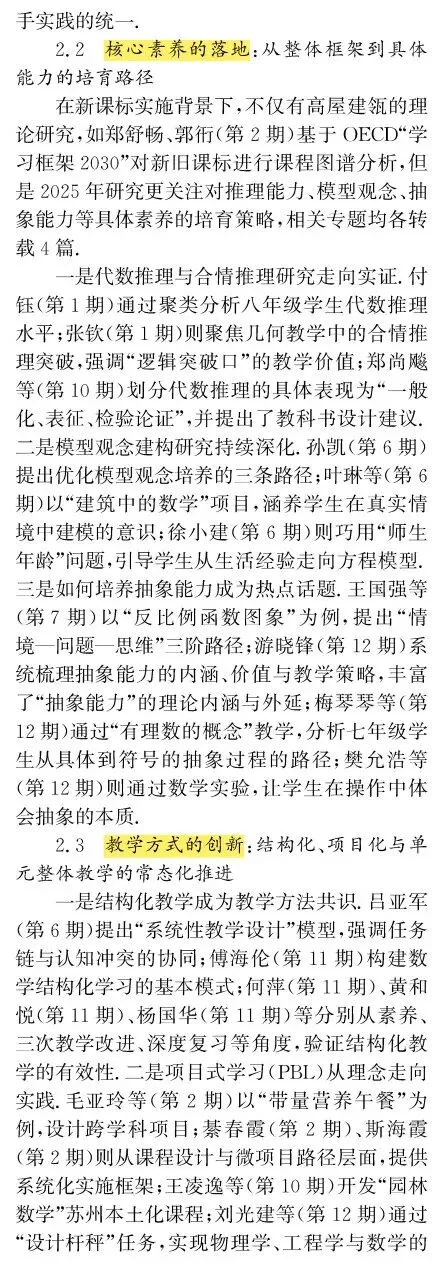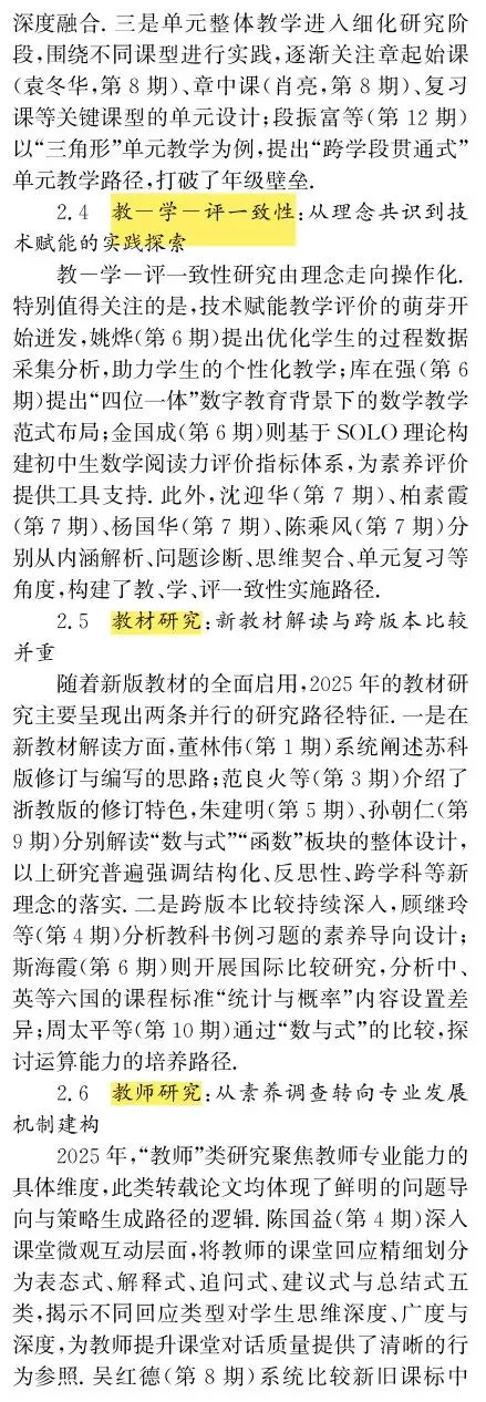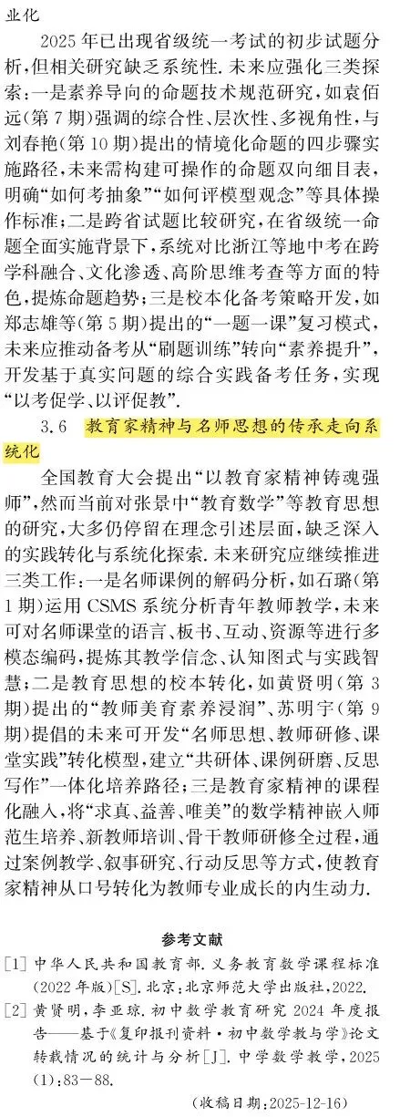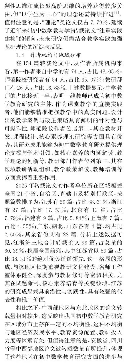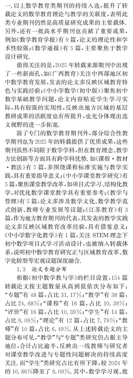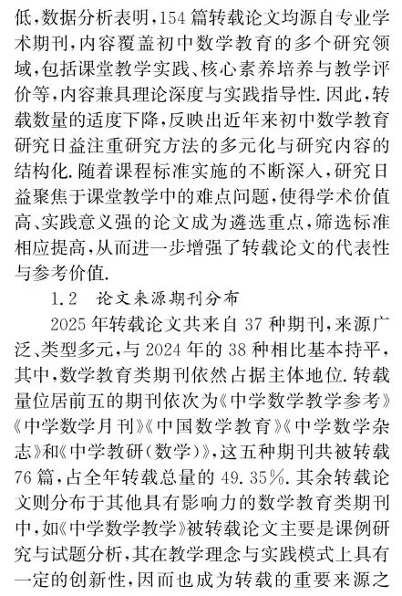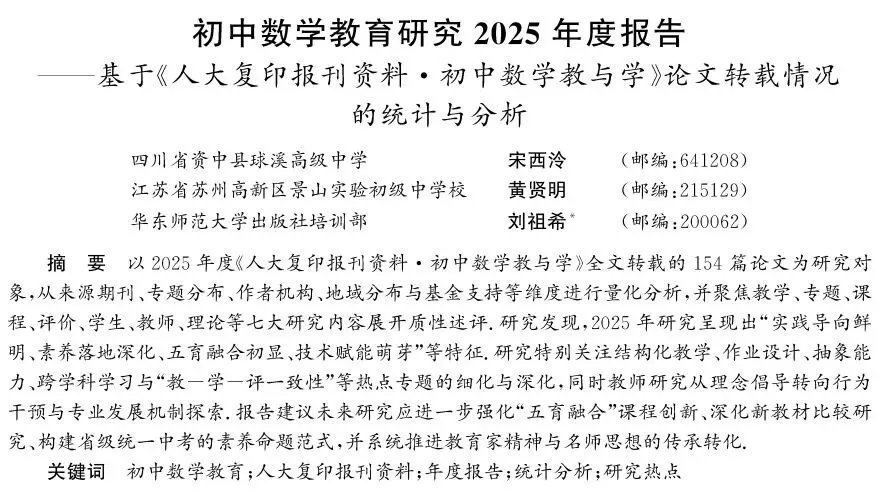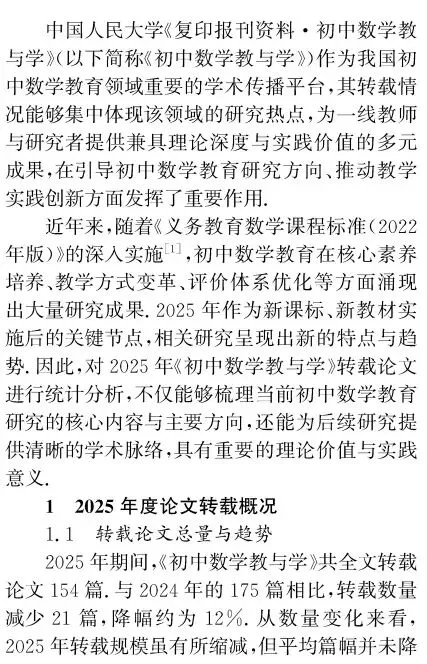 引用格式:[1]宋西泠,黄贤明,刘祖希.初中数学教育研究2025年度报告——基于《人大复印报刊资料·初中数学教与学》论文转载情况的统计与分析[J].中学数学教学,2026(2):82-86.