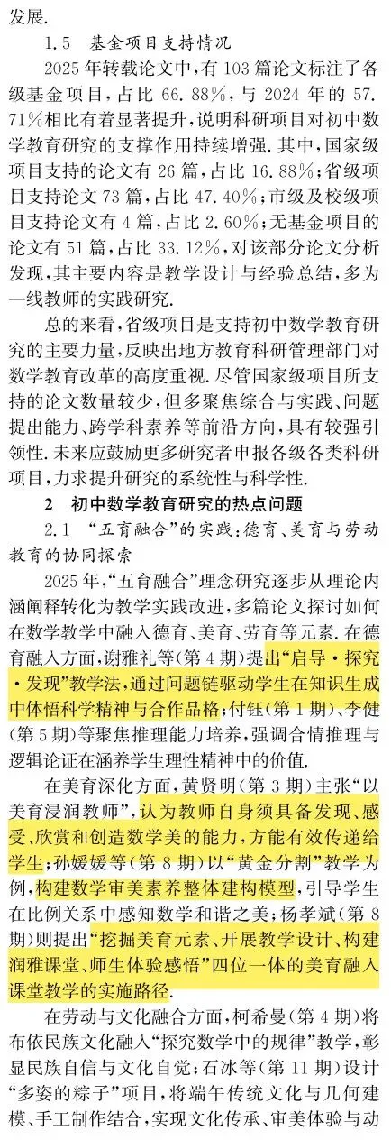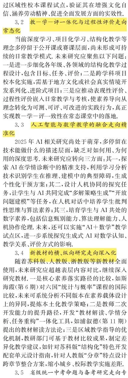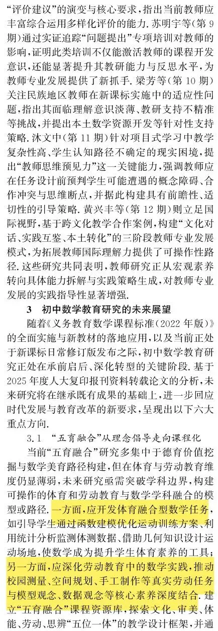 此外,在未来展望方面,文章更为面面俱到,给出了6点,可能围绕几个板块展开,如教学(AI)、教师(教育家精神)、评价(中考、教学评)、课程(五育融合)、教材(新教材),确实有些是重点,但缺少学生研究的展望,且在“五育融合”中,人大转载又将其弱化为德育、美育与数学教育的融合,这就表明数学教育的特殊性使其与体育、劳动教育融合较为困难,并不能作为热点加以讨论,这方面可能叙述的稍显偏离,可以多关注数学美育研究,2026年教学方面转载的文章有好几篇美育了,也转载了理论的美育文章,说明这就是热点,是未来数学教育需要在立德树人方面奋斗的大方向。