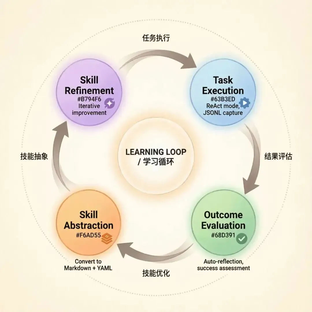 v0.2.0 的核心是自进化功能的完整落地。具体实现是一个四阶段学习循环: