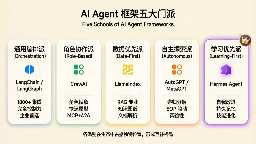 LangChain:通用编排,但开发者开始流失 LlamaIndex:RAG 专业,无可替代 CrewAI:多 Agent 业务工作流,快速占领市场 Hermes Agent:学习优先单 Agent,差异化生存