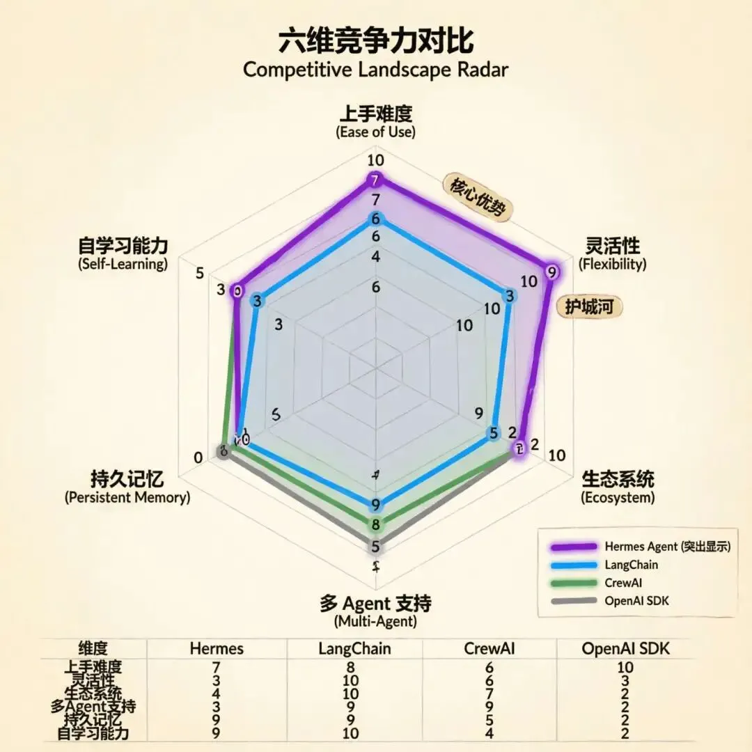 图:Hermes Agent 与主要竞品的六维竞争力对比