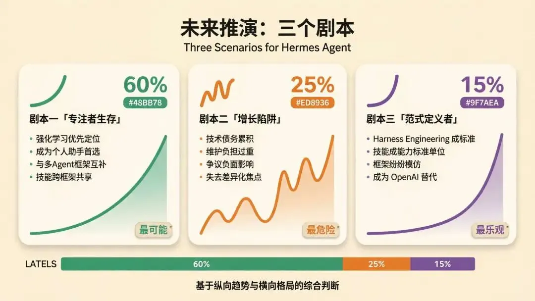 基于纵向趋势和横向竞争格局,以下是 Hermes Agent 的三个可能剧本: