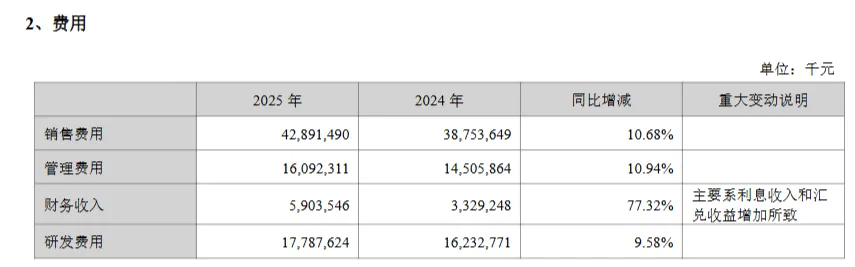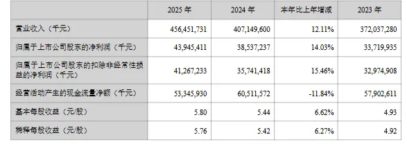 营收4564.52亿元,同比增长12.1%;归母净利润439.45亿元,同比增长14.0%;毛利率26.2%,与2024年基本持平;扣非净利润412.67亿元,同比增长15.46%。