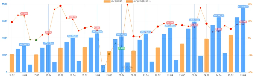 核心利润413.13亿元,同比增长16.59%;Q4核心利润58.83亿元,同比增长18.21%。