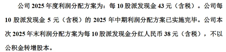 每股分红3.8元(含税),约计分红金额285.87亿元,再加上年中每股分红0.5元、分红金额34.48亿元,两次分红合计320.35亿元,占年度净利润73%。