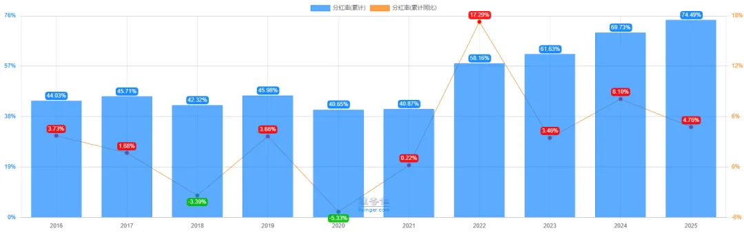 近四年分红额是逐渐提升,2025年的分红率达到了74.49%,越来越高了。