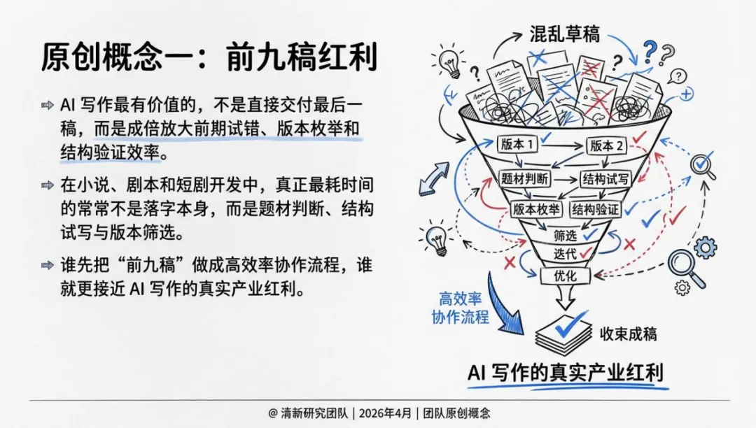 AI最擅长的,恰恰是成倍放大前期试错和枚举的效率。它可以在一个上午给出九个不同方向的大纲,让你像产品经理一样做A/B测试。谁先把前九稿变成高效的人机协作流程,谁就拿到了AI写作的真实红利。