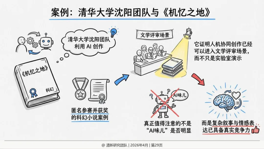 真实案例:清华大学沈阳团队用AI辅助创作的《机忆之地》、华中农业大学陶炜的《光影穿梭者》、北京航空航天大学何静的《重生当铺:第九号柜台》。这些作品都不是AI独立完成,而是人类设定骨架加AI填充血肉加人类审美修剪。