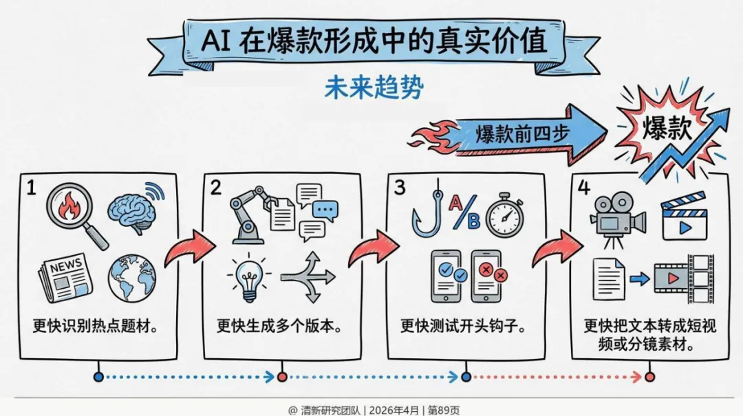市场越大,题材迭代越快,试错成本越高。传统人力创作模式下,一个作者花三个月写完一部小说,上线后才发现题材过时。这种痛苦,AI最先解决的不是写得好不好,而是前置探索成本。用AI快速生成不同题材、不同开头的前几稿,让人类把精力留给最后的艺术判断。