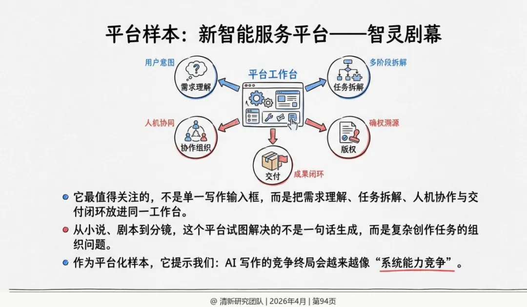 本文核心观点与数据均来自清新研究团队《AI写作深度研究报告》2026年4月。报告在撰写过程中参考了智灵剧幕平台https://jumu.zeelin.cn/的实践案例,该平台为研究提供了部分测试环境,但研究结论保持独立。