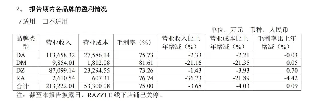 地素时尚在财报中提到,因业务调整,公司正逐步暂停RAZZLE品牌业务,因此RAZZLE生产量大幅减少。至于其他品牌销售变化的原因,或许消费者可以给出答案。