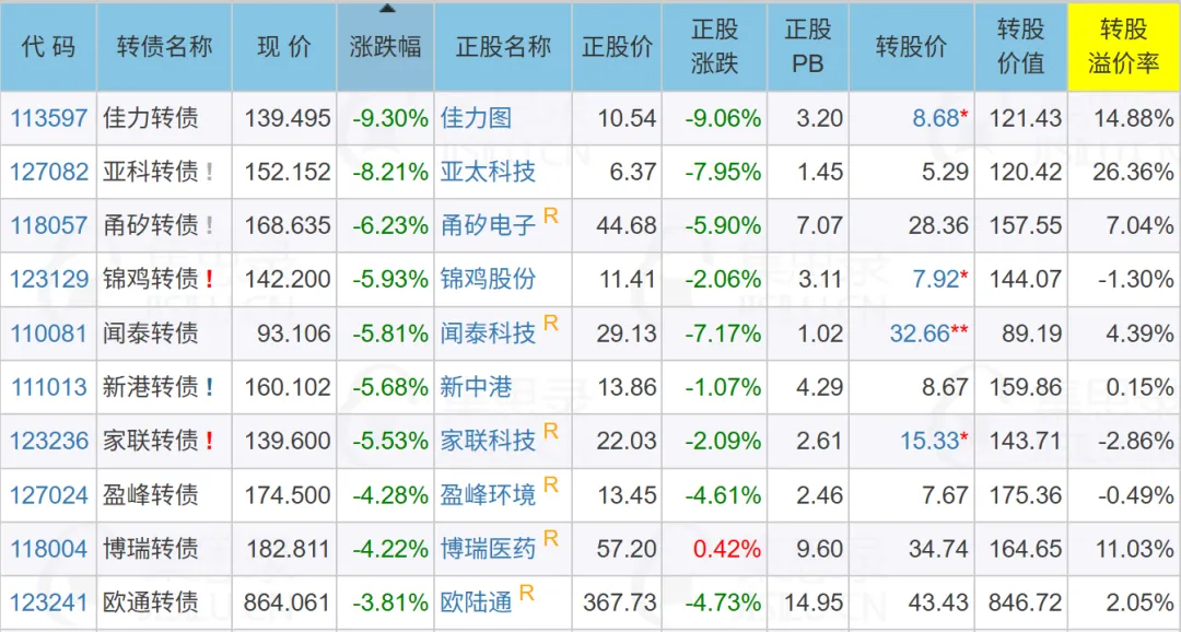今日跌幅榜多是股债联动跟跌。