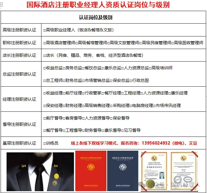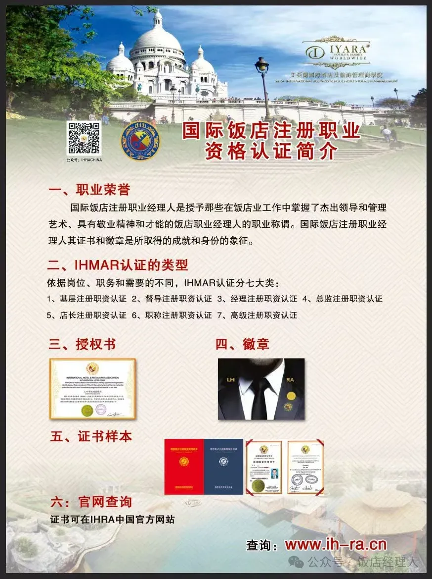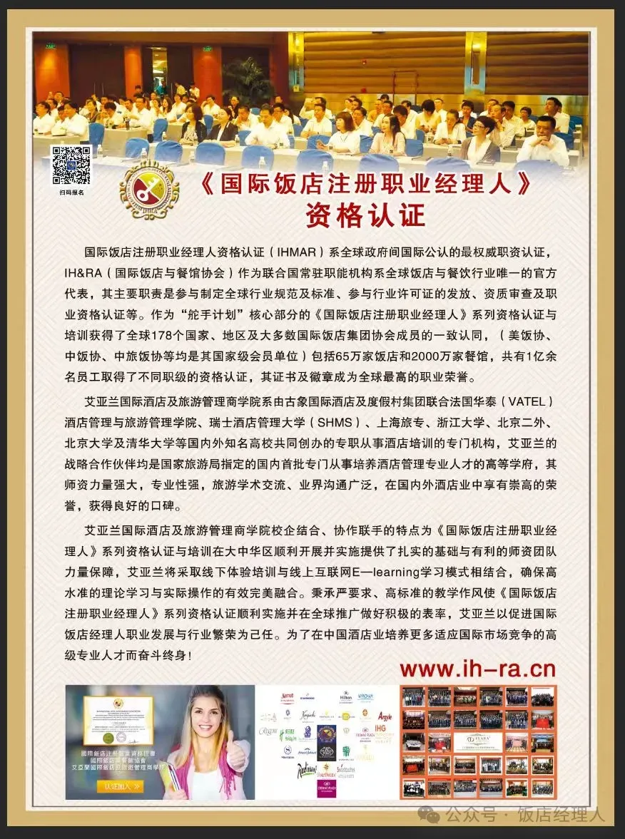 国际饭店注册职业经理人资格认证(IHMAR)系全球政府间国际公认的最权威职资认证,IH&RA(国际饭店与餐馆协会)作为联合国六大常驻机构系全球饭店与餐饮行业唯一的官方代表,其主要职责是参与制定全球行业规范及标准、参与行业许可证的发放、资质审查及职业资格认证等。作为“舵手计划”核心部分的《国际饭店注册职业经理人》系列资格认证与培训获得了全球近178个国家、地区及大多数国际饭店集团协会成员的一致认同,(美饭协、中饭协、中旅饭协等均是其国家级会员单位)包括65万家饭店和2000万家餐馆,共有1亿余名员工取得了不同职级的资格认证,其证书及徽章成为全球最高的职业荣誉。IH&RA中国官方网站www.ih-ra.cn 咨询:13956024932(微电)