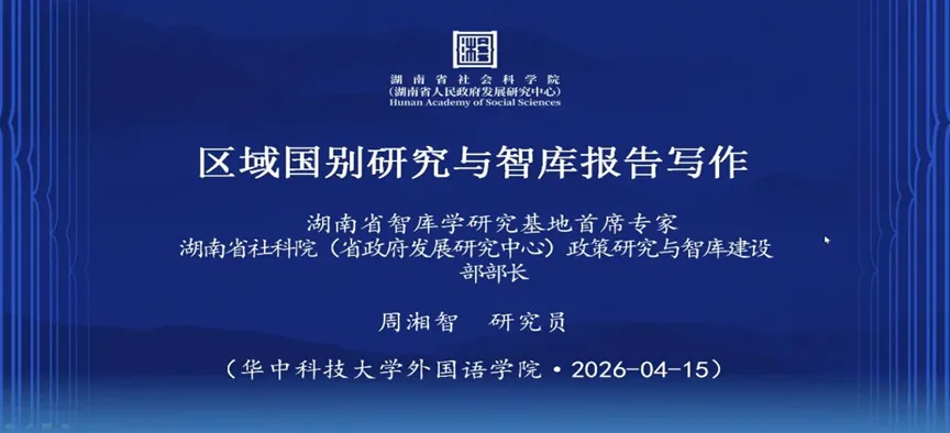 为进一步提升我院在国际战略与区域国别研究领域的科研能力与学术水平,2026年4月15日下午,我院特邀湖南省社会科学院(湖南省人民政府发展研究中心)政策研究与智库建设部部长周湘智,举办了题为《区域国别研究与智库报告写作》的线上学术讲座。副院长林纯洁出席讲座,讲座由我院国别(区域)研究中心主任王竞超主持。