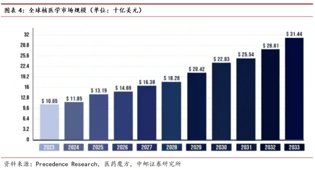 另一份报告显示数据则更为乐观,预测全球核医学市场将从2023年的106亿美元增长至2033年的314亿美元,CAGR高达15.2%。