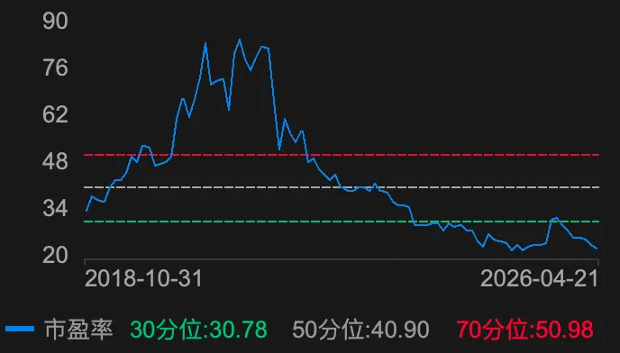 --当前市盈率 23.67,比历史上 95.56% 时间低